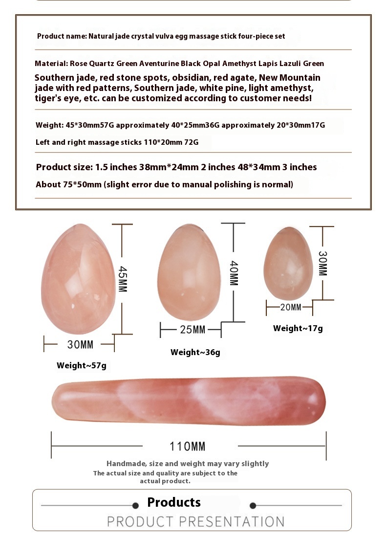 Size: 4-piece set of lvdongling eggs, 4-piece set of amethyst eggs, 4-piece set of powder Crystal Egg eggs, 4-piece set of white crystal eggs, 4-piece set of obsidian eggs, 4-piece set of olive green eggs, 4-piece set of tiger-eye eggs, 4-piece set of Redstone eggs, 4-piece set of white-barked pine eggs, 4-piece set of African blood Stone, 4-piece set of Xiuyan jade eggs, 4-piece set of southern jade eggs, 4-piece set of black lines and red lines eggs, 4-piece set of Dragon Blood Stone eggs, massage stick pink crysta